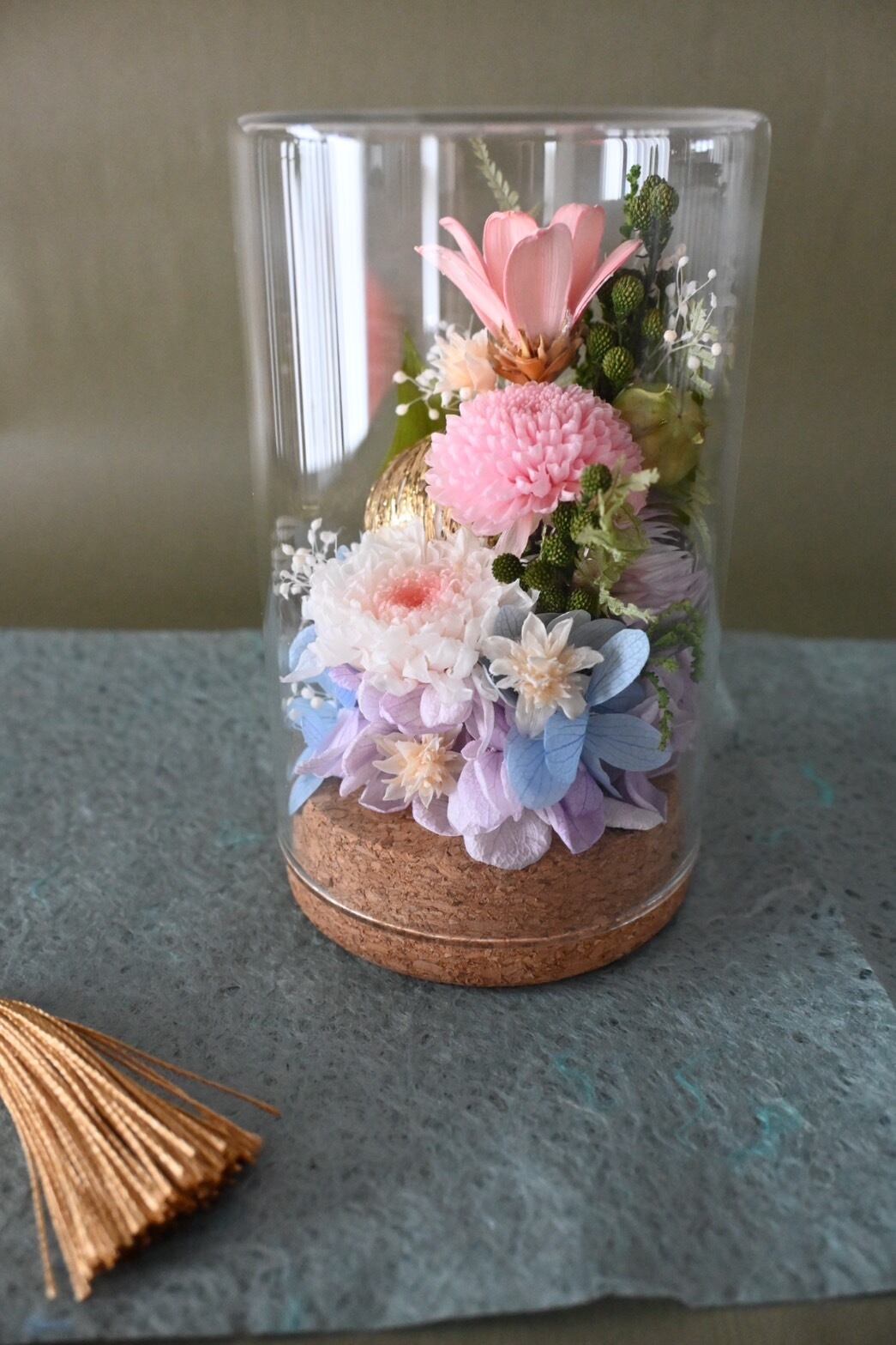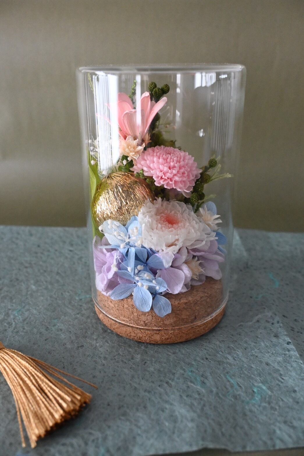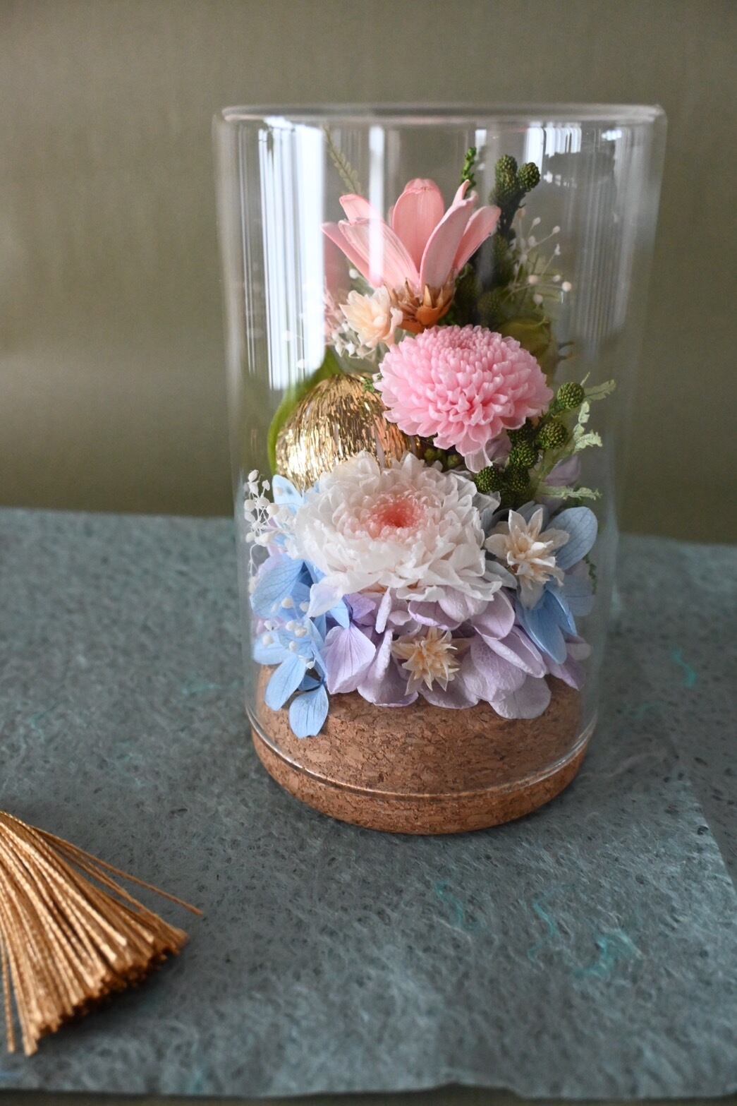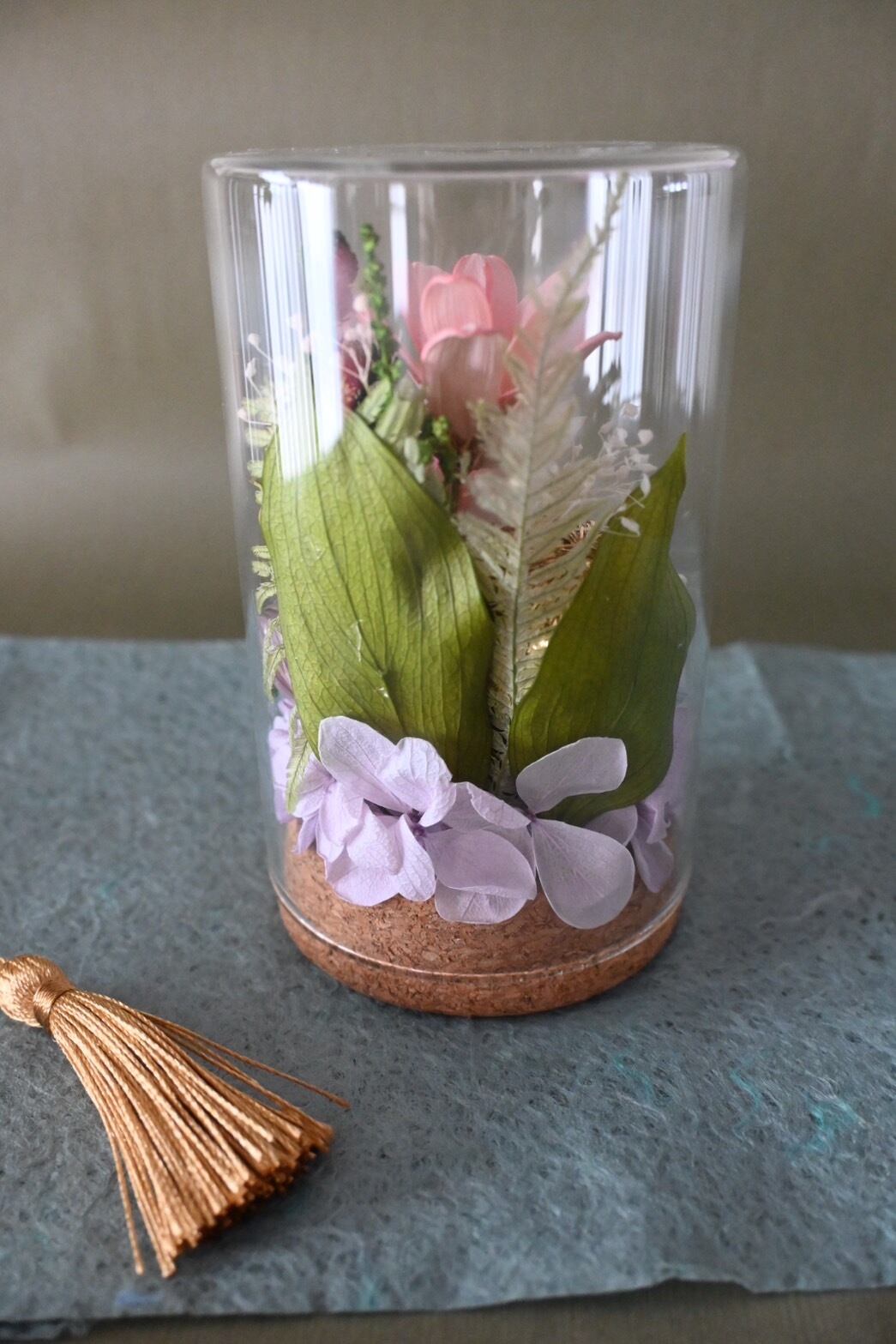 小さなガラスボトルの中にお花を閉じ込めました。