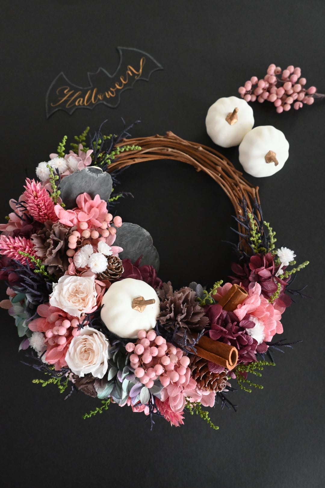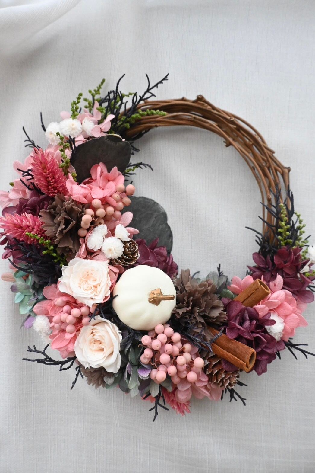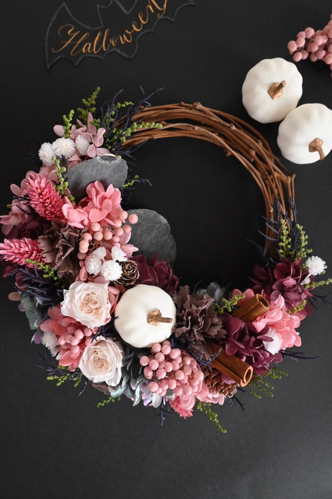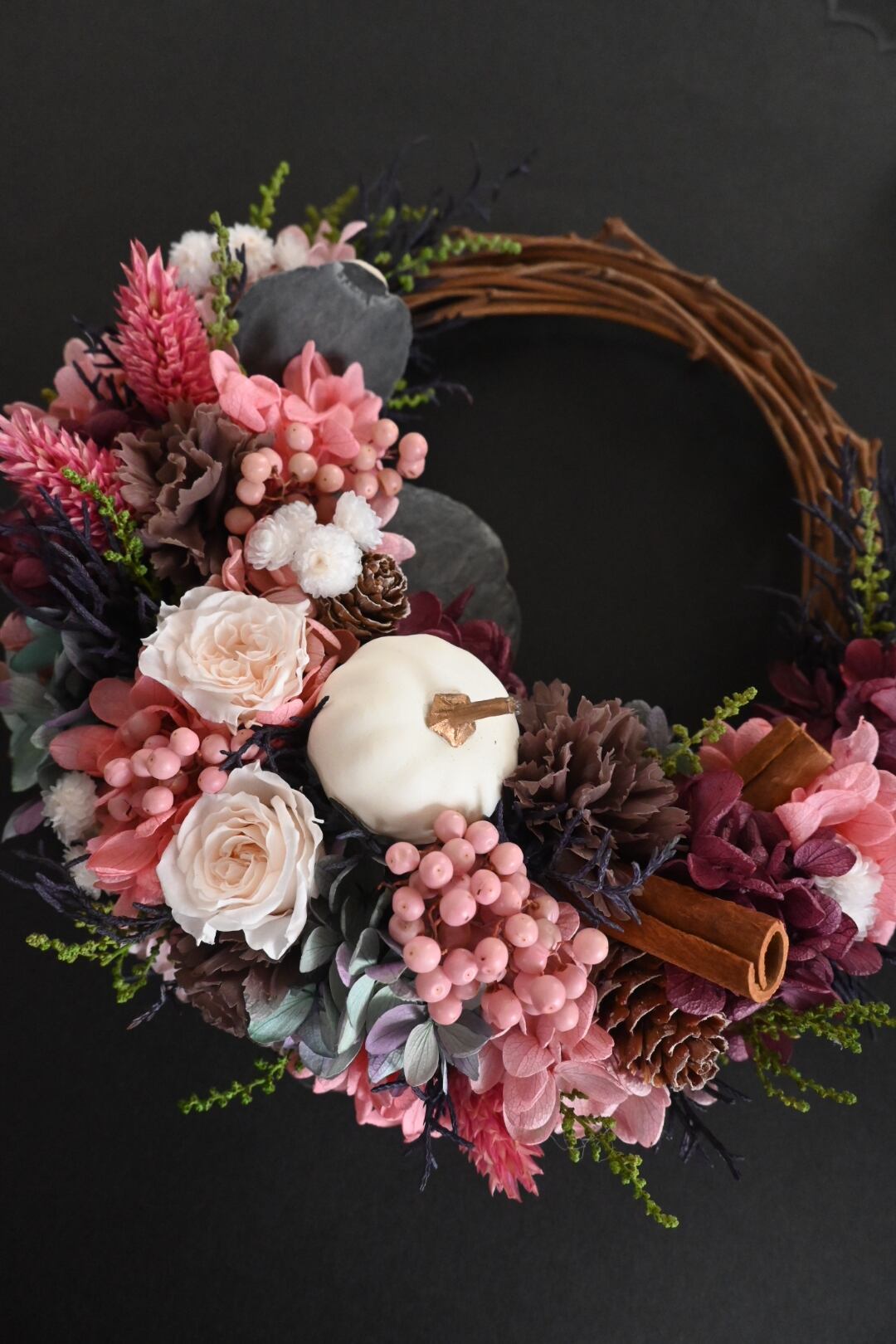 明るいピンクとホワイトに、ダークなパープルやブラウンを合わせることで大人っぽく仕上がっております。実物もたっぷりで秋にぴったりのリースです✨
