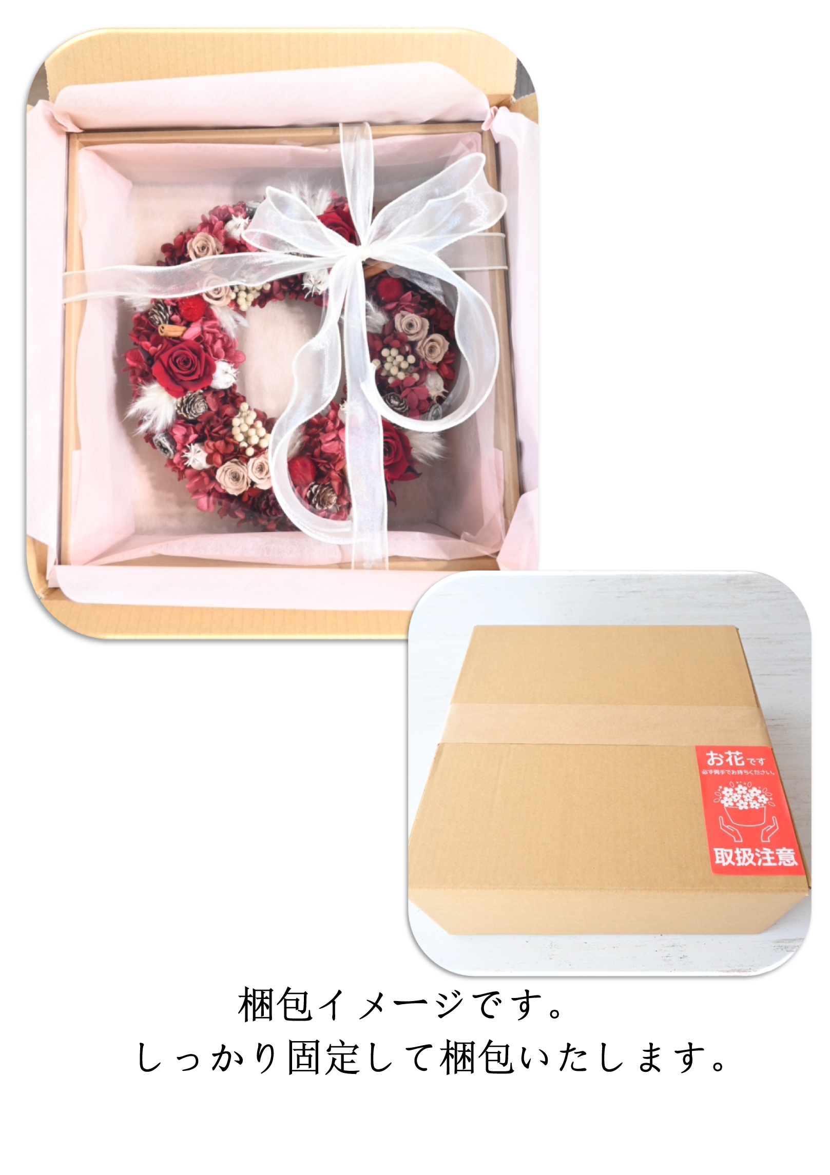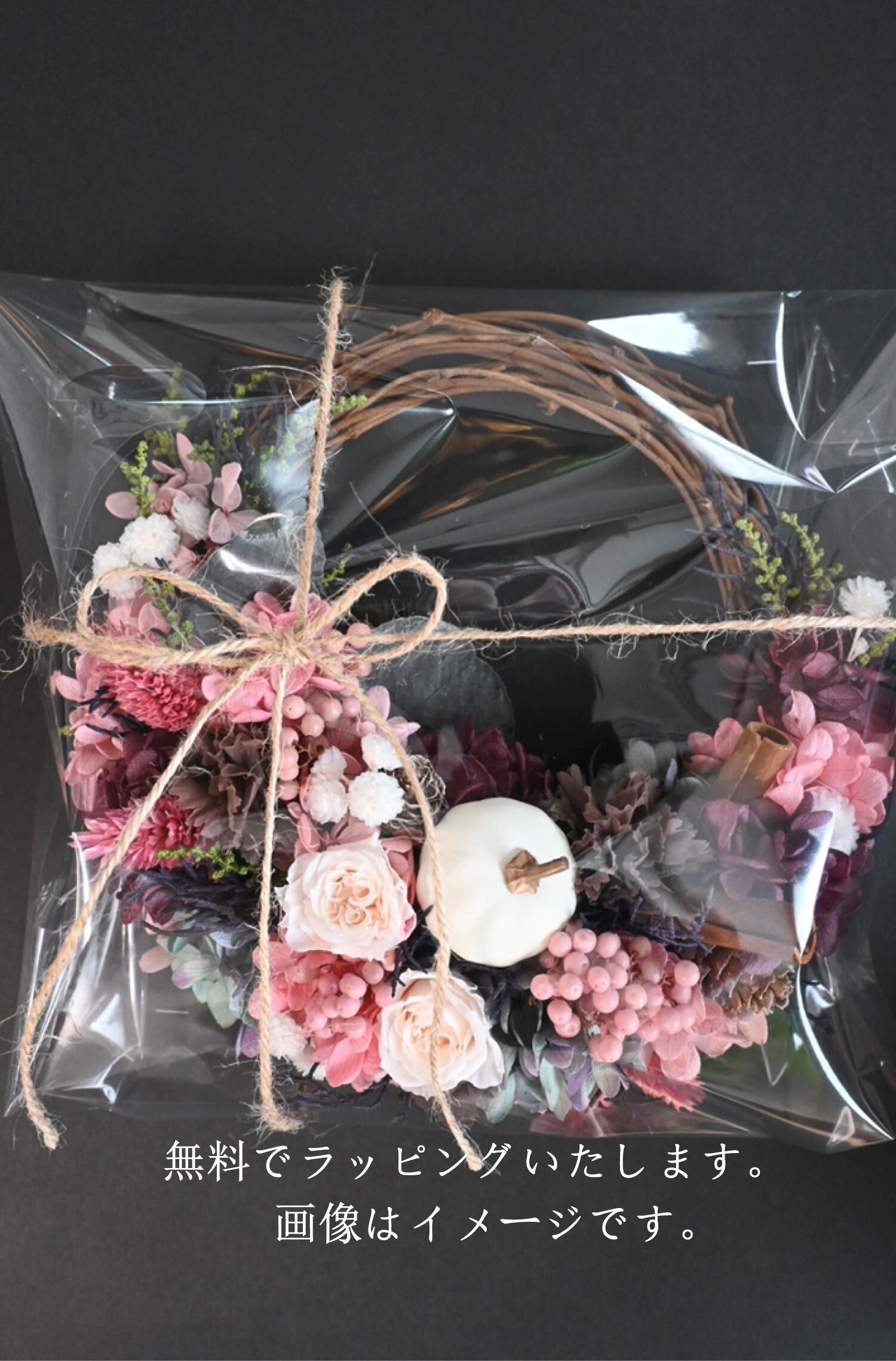ご注文頂いてから1点1点お作りしておりますので、仕入れ状況により使用する花材(メイン花材を除く)に変更が生じたり、元々は生花のためお花の表情に多少違いがある場合もございます。色合いや雰囲気には影響いたしませんが、何卒ご了承くださいますようお願いいたします。