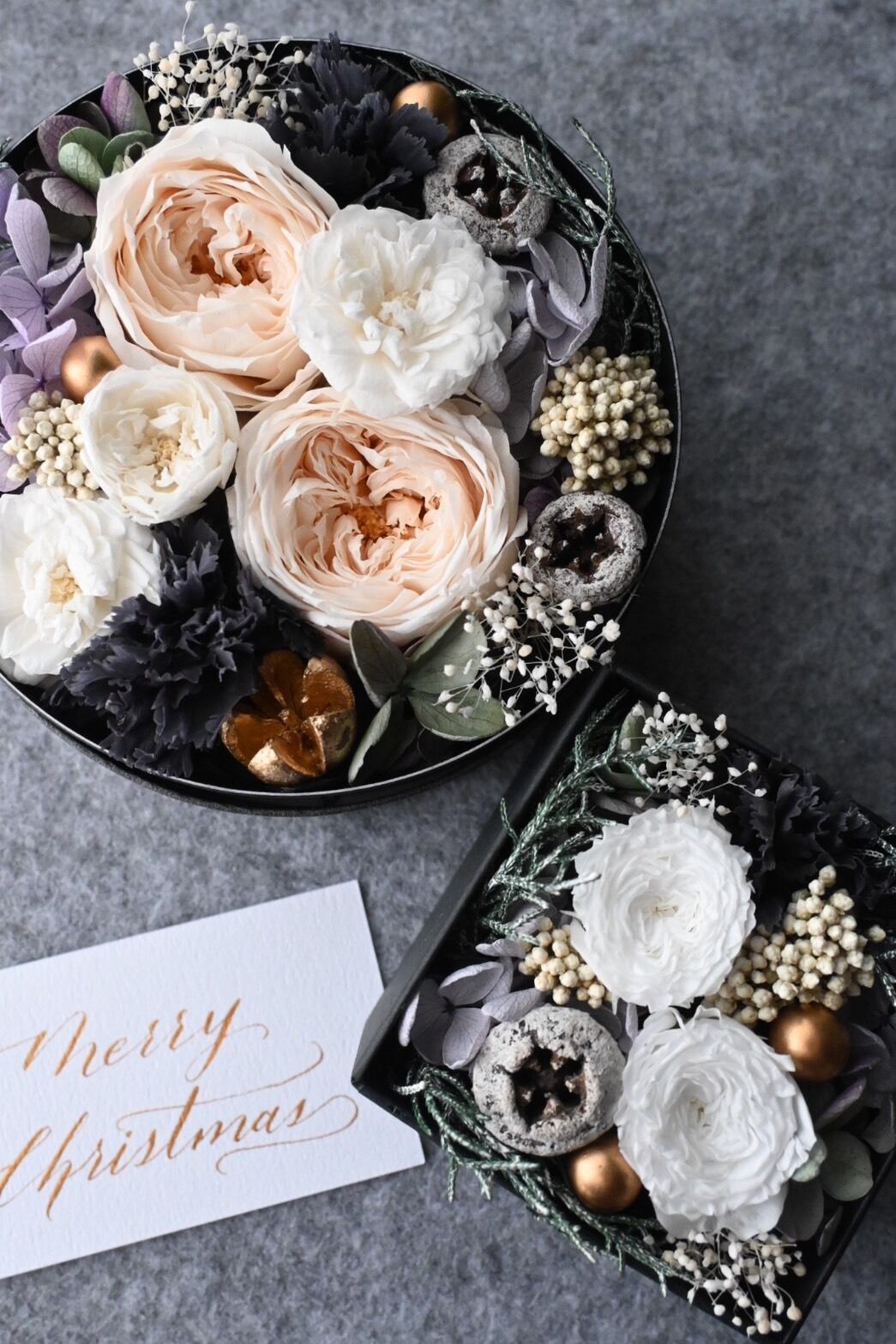 BOXアレンジはフタを開けるときのドキドキ感が、特別さを演出してくれますので、クリスマスギフトに限らず、お誕生日や記念日などの特別な贈り物にもピッタリです。