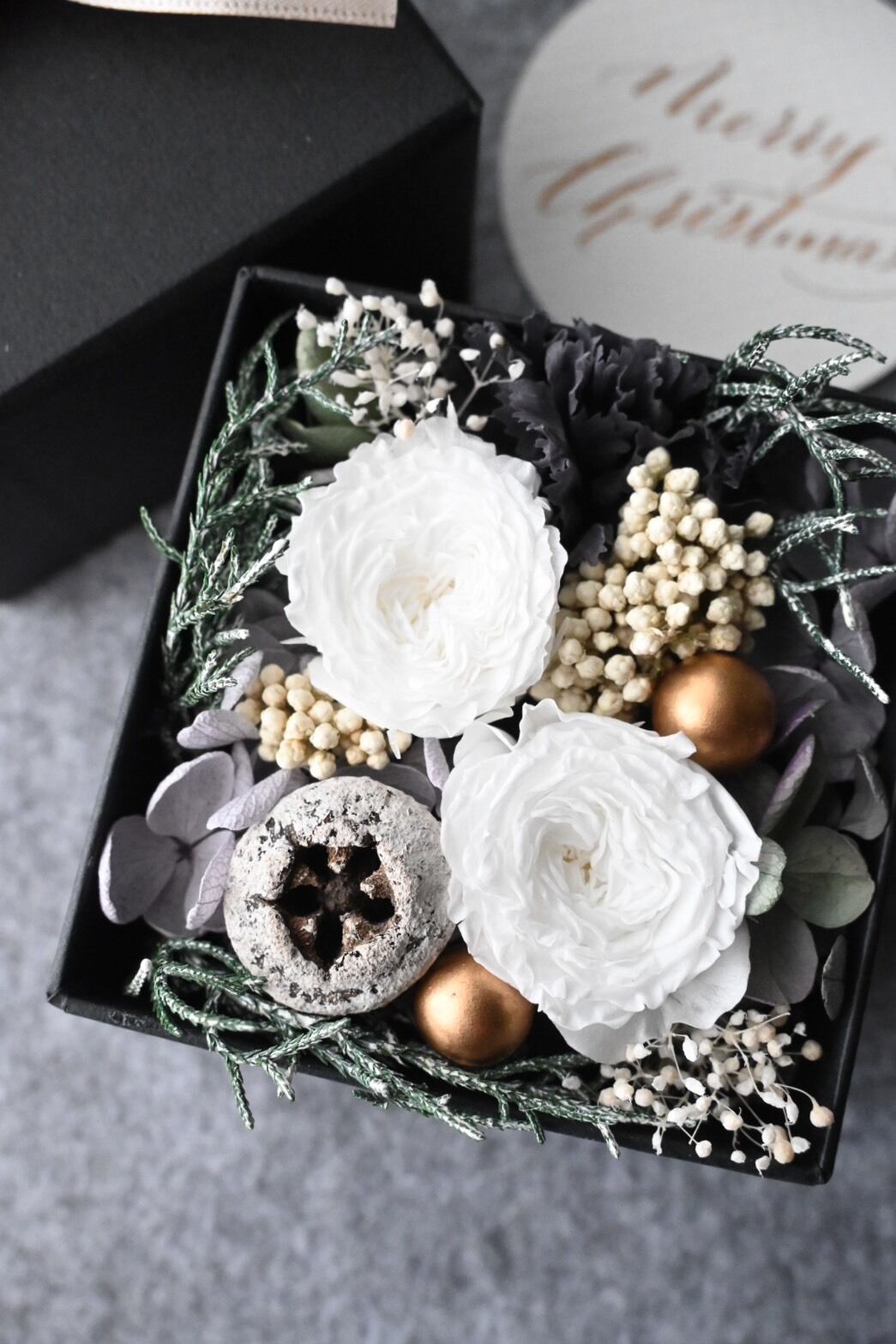 小さいながらも存在感のあるカップ咲きのバラを使用したBOXアレンジです。雪の降る静かなクリスマスをイメージして、大人っぽくシックな雰囲気に仕上げました。