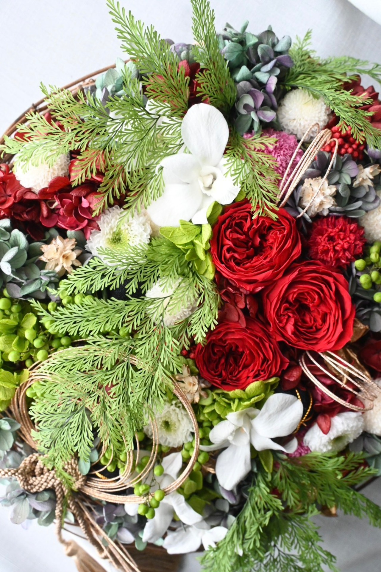 コロコロした丸い花材に、流れのあるグリーンや水引を合わせることで動きを付けました。特にグリーンのタバリアファーンは優しく揺らめくように配置しております。グリーンと白の組み合わせや、実物、ブルー系のあじさいにより瑞々しさもプラスされ、一見生花と区別が付かないほどの仕上がりです。