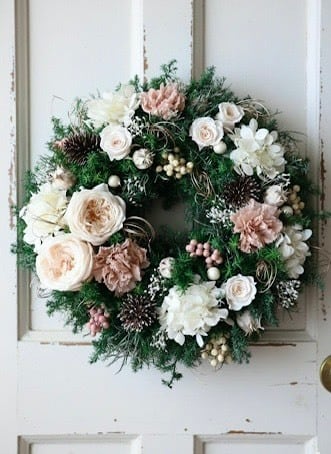 たっぷりのプリザグリーンをベースに、くすみピンクのカーネーションやホワイトのあじさいをフワッと配置し、冬の森をイメージした柔らかな雰囲気のリースに仕上げました。