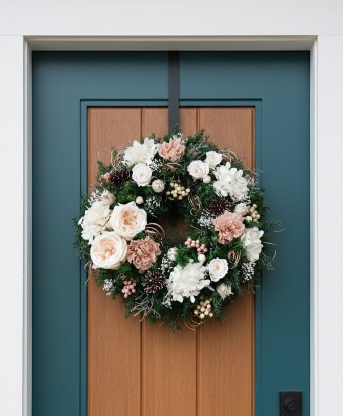 たっぷりのプリザグリーンをベースに、くすみピンクのカーネーションやホワイトのあじさいをフワッと配置し、柔らかな雰囲気のリースに仕上げました。