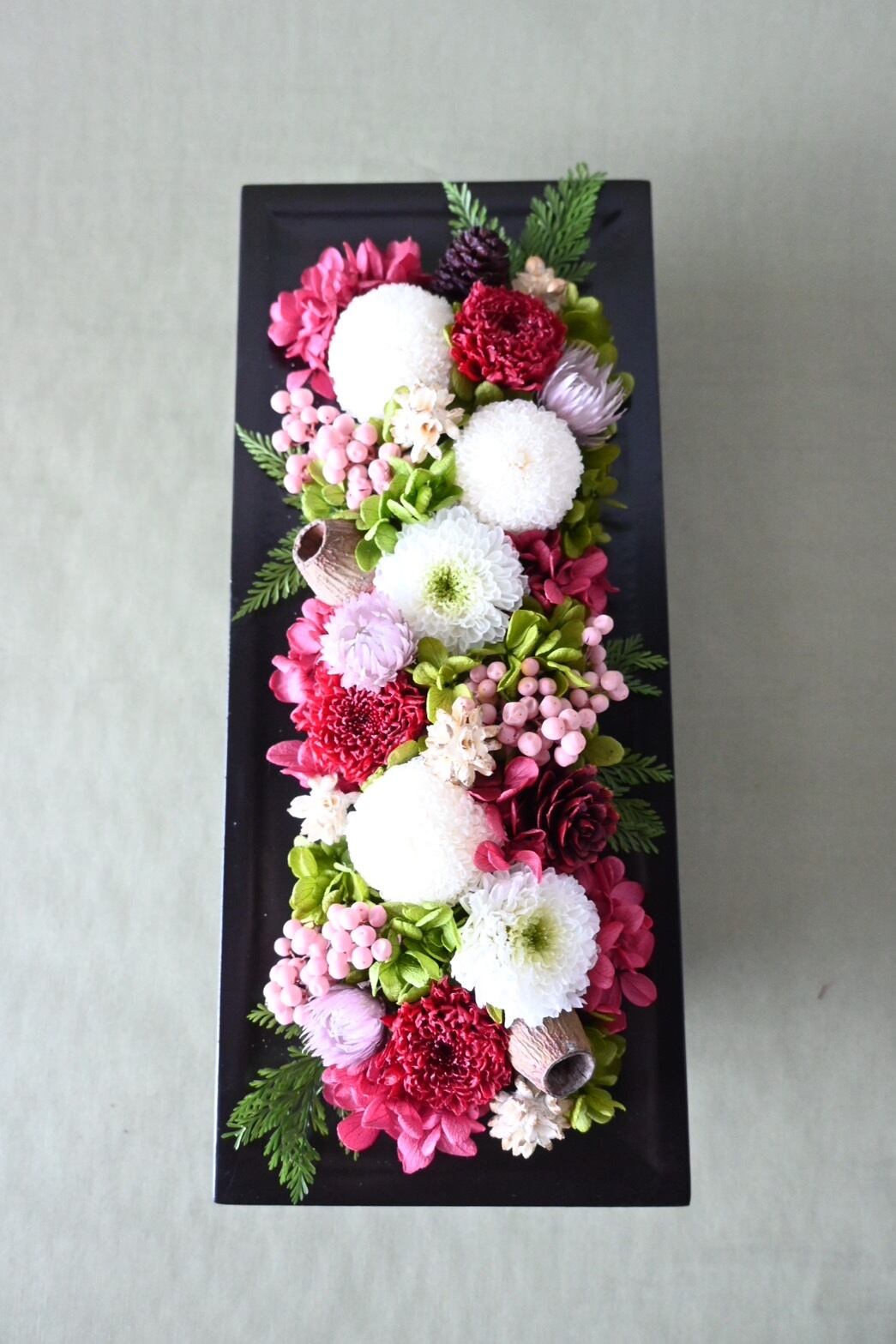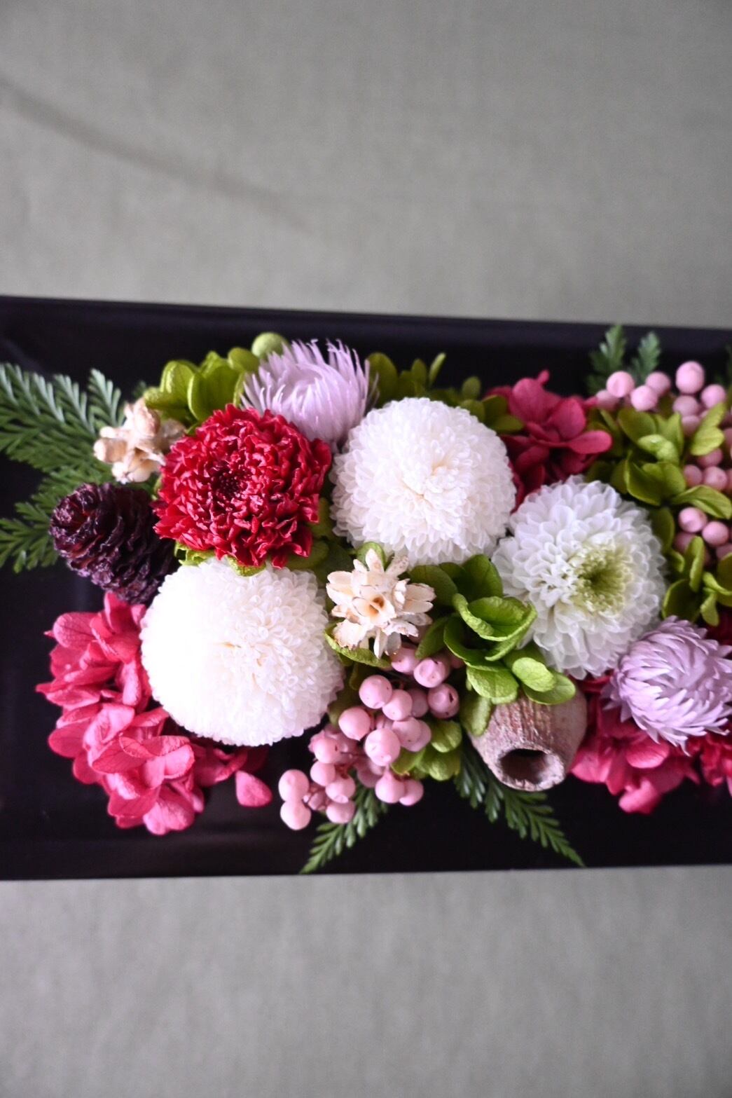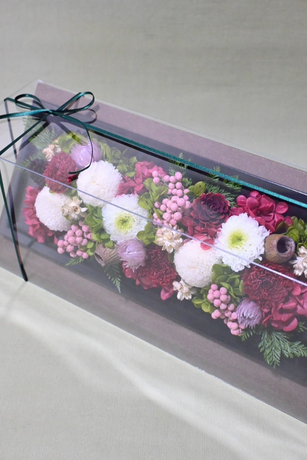ご注文頂いてから1点1点お作りしておりますので、仕入れ状況により使用する花材(メイン花材を除く)に変更が生じたり、元々は生花のためお花の表情に多少違いがある場合もございます。色合いや雰囲気には影響いたしませんが、何卒ご了承くださいますようお願いいたします。