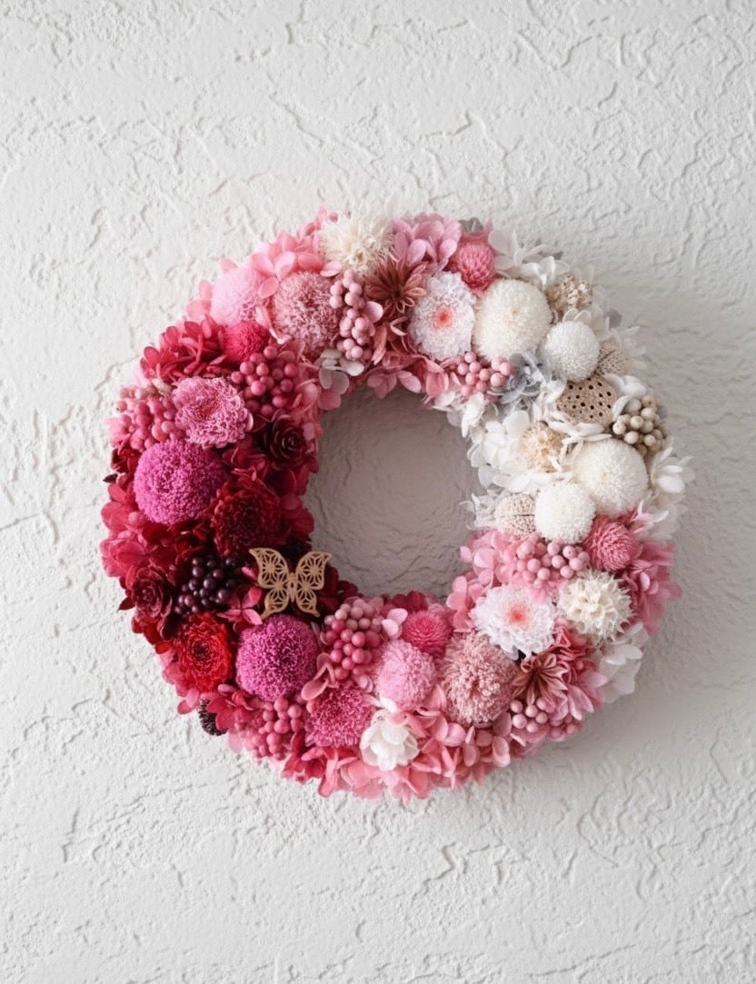 また、円形のリースは切れ目(終わり)がないことから『永遠』を意味すると言われております。永遠に続く愛や長寿などの願いが込められたり、幸福を呼び込むアイテムとして人気があります。新しく迎える年が、明るく幸せに満ちあふれたものになりますように。そんな願いを込めた作品です。お正月飾りの一つとしてこんなリースがあってもいいのでは♪もちろん一年中飾って頂いても問題ありません。
