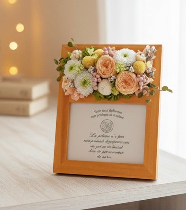 お花のボリュームはたっぷりですが、ウッドの温かみを邪魔しない優しい雰囲気に仕上がっております。見るたびにほっこりした気持ちになれる、そんなフォトフレームです。